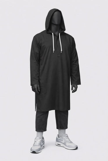 This Hooded Kameez Top blends traditional modest wear with a modern streetwear edge. Designed as a standalone top, it features a relaxed, straight-cut silhouette with a structured hood and adjustable drawstrings for a contemporary finish. The buttoned neckline adds subtle detail while maintaining clean, effortless styling.