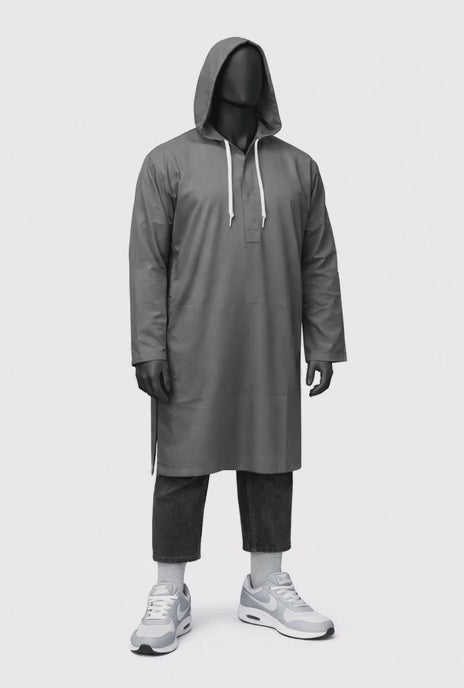This Hooded Kameez Top blends traditional modest wear with a modern streetwear edge. Designed as a standalone top, it features a relaxed, straight-cut silhouette with a structured hood and adjustable drawstrings for a contemporary finish. The buttoned neckline adds subtle detail while maintaining clean, effortless styling.