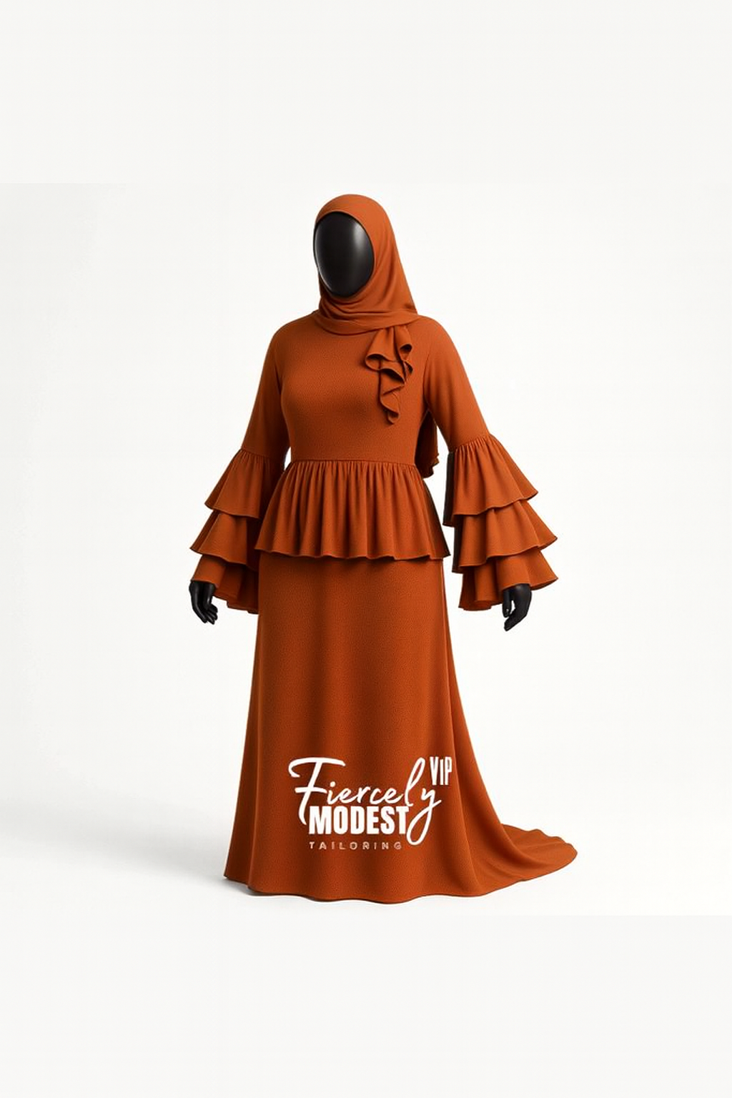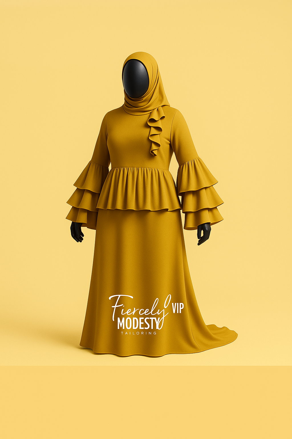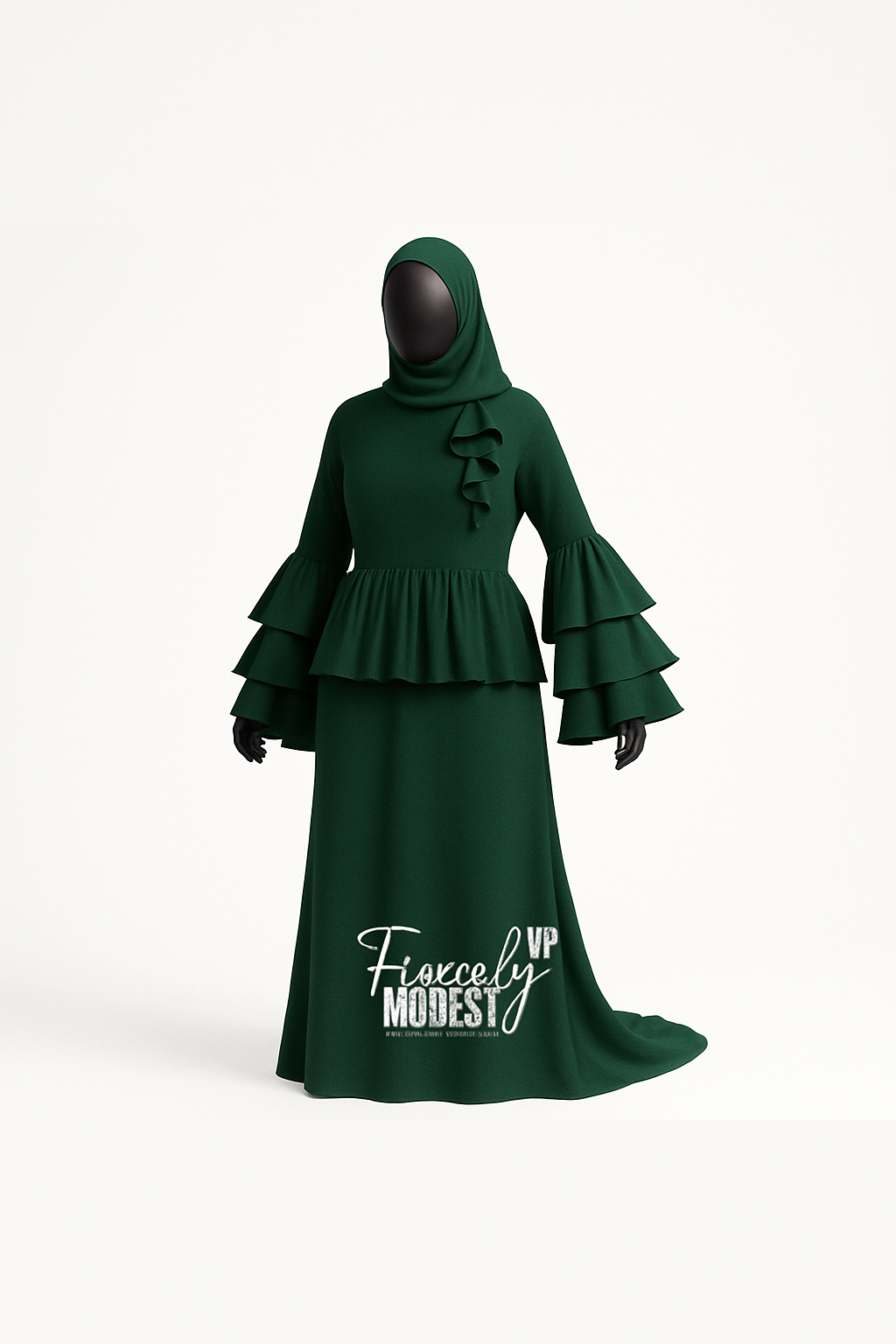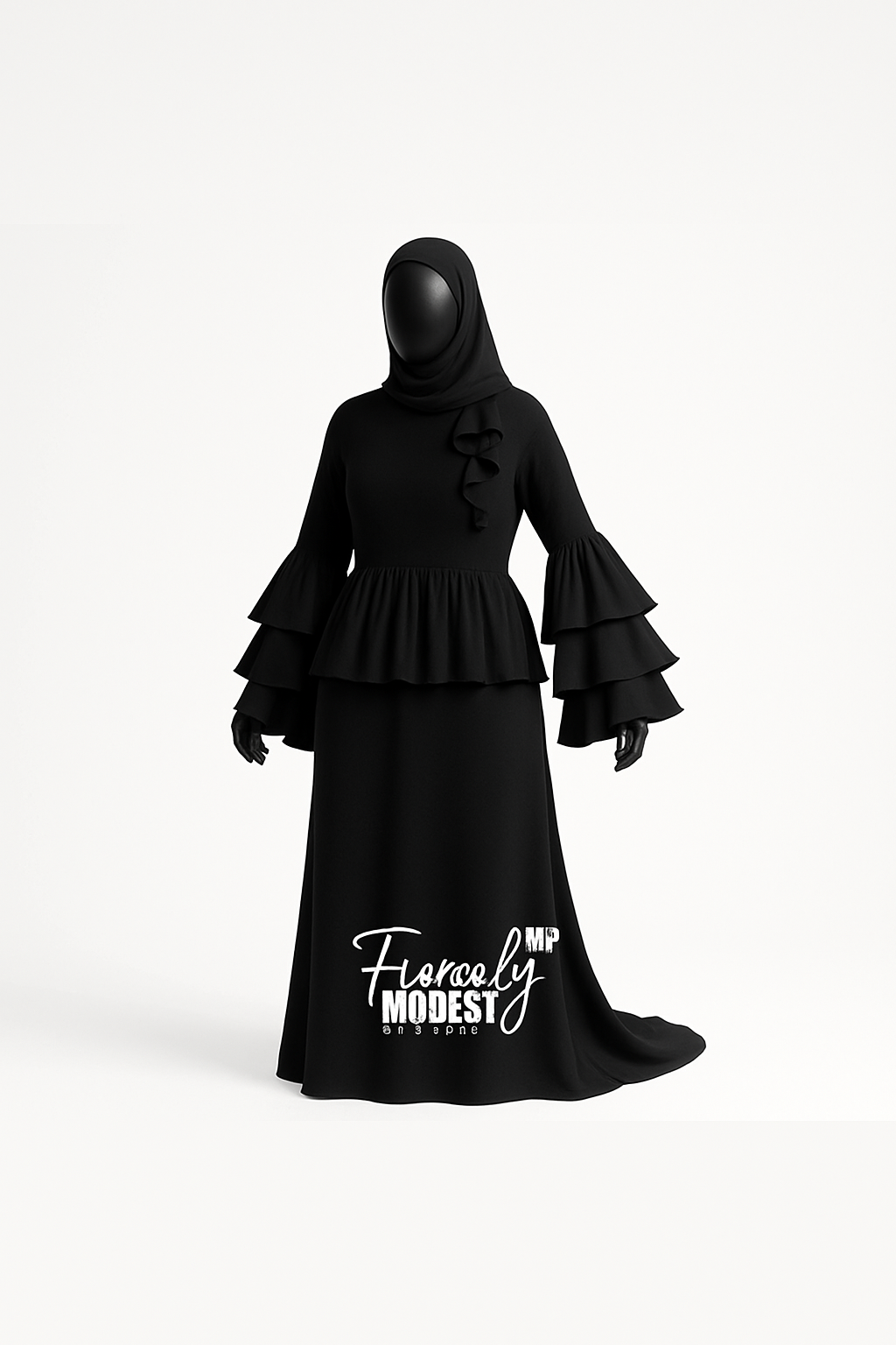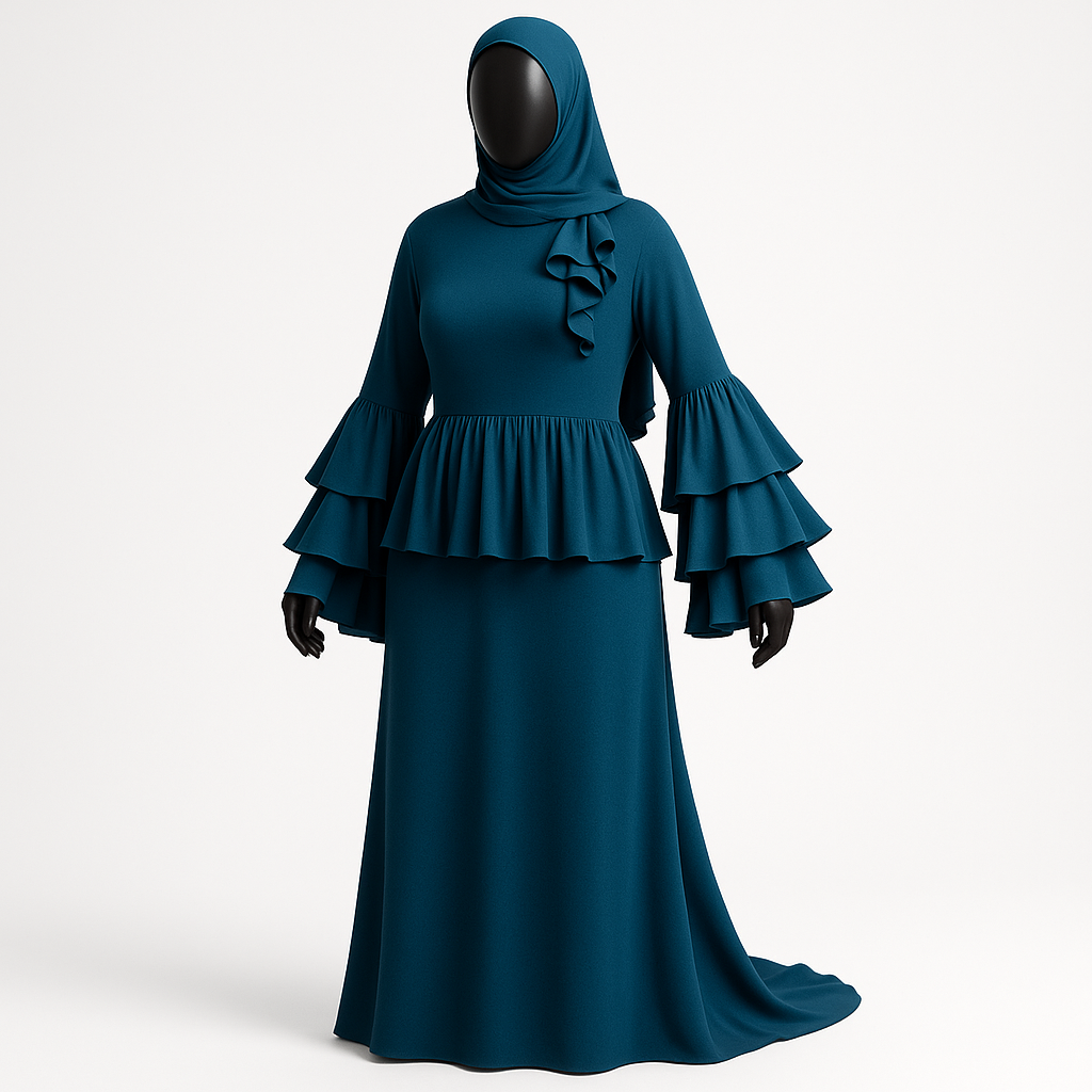 Gracefully tailored for elegance and comfort, this ruffle peplum abaya features layered bell sleeves and a flattering gathered waistline that drapes beautifully into a full-length skirt. The soft, flowing fabric moves effortlessly with every step, while the modest silhouette maintains refined sophistication.