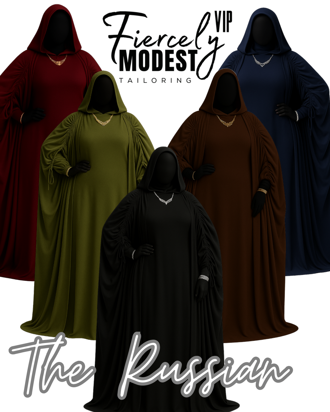 Pair The Russian with gold/sliver jewelry, a matching hijab, or soft neutral tones for a powerful yet refined look—perfect for gatherings, events, or everyday elegance.